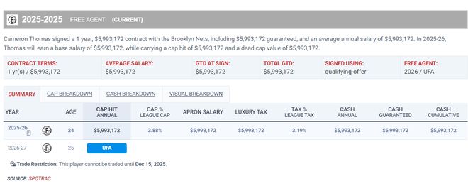 实际上托马斯24-25赛季场均31.2分钟,拿到24分3.8助攻3.3篮板0.6抢断0.1盖帽,命中率43.8%,三分命中率34.9%,他这个数据只获得一年599万实在是说不过去,而且这个首秀说明他不是不能打一号位,进攻型一号位现在很吃香。